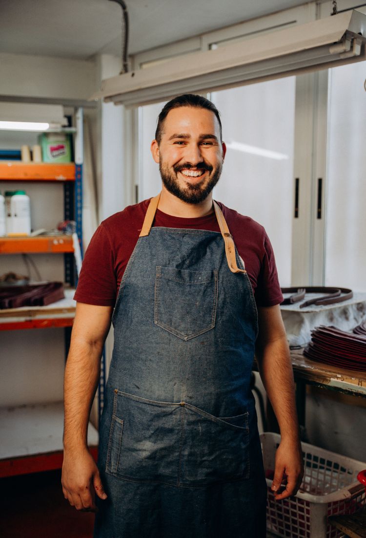 In the workshop, he is responsible for the polishing and dyeing of the bags, a job that requires patience, precision and a great sense of detail. He likes to know that each piece that passes through his hands gains a life and personality of its own.