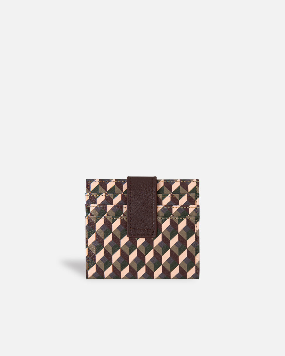 The new medium wallet with print from Lonbali features a square design with snap tab closure, holds six cards inside and six cards on the outside. It also contains an additional pocket for bills. It features the brand's logo engraved on the front closure.