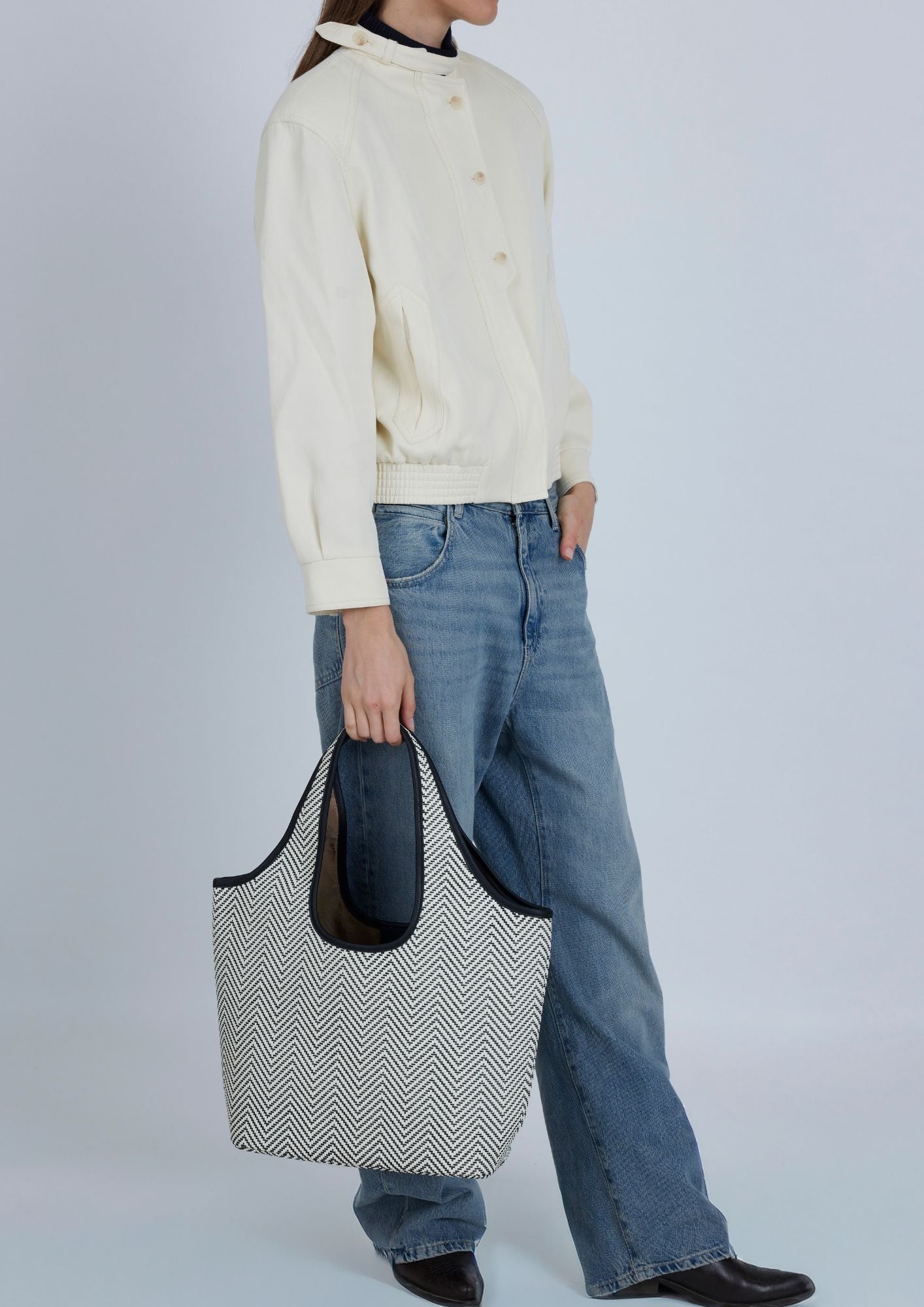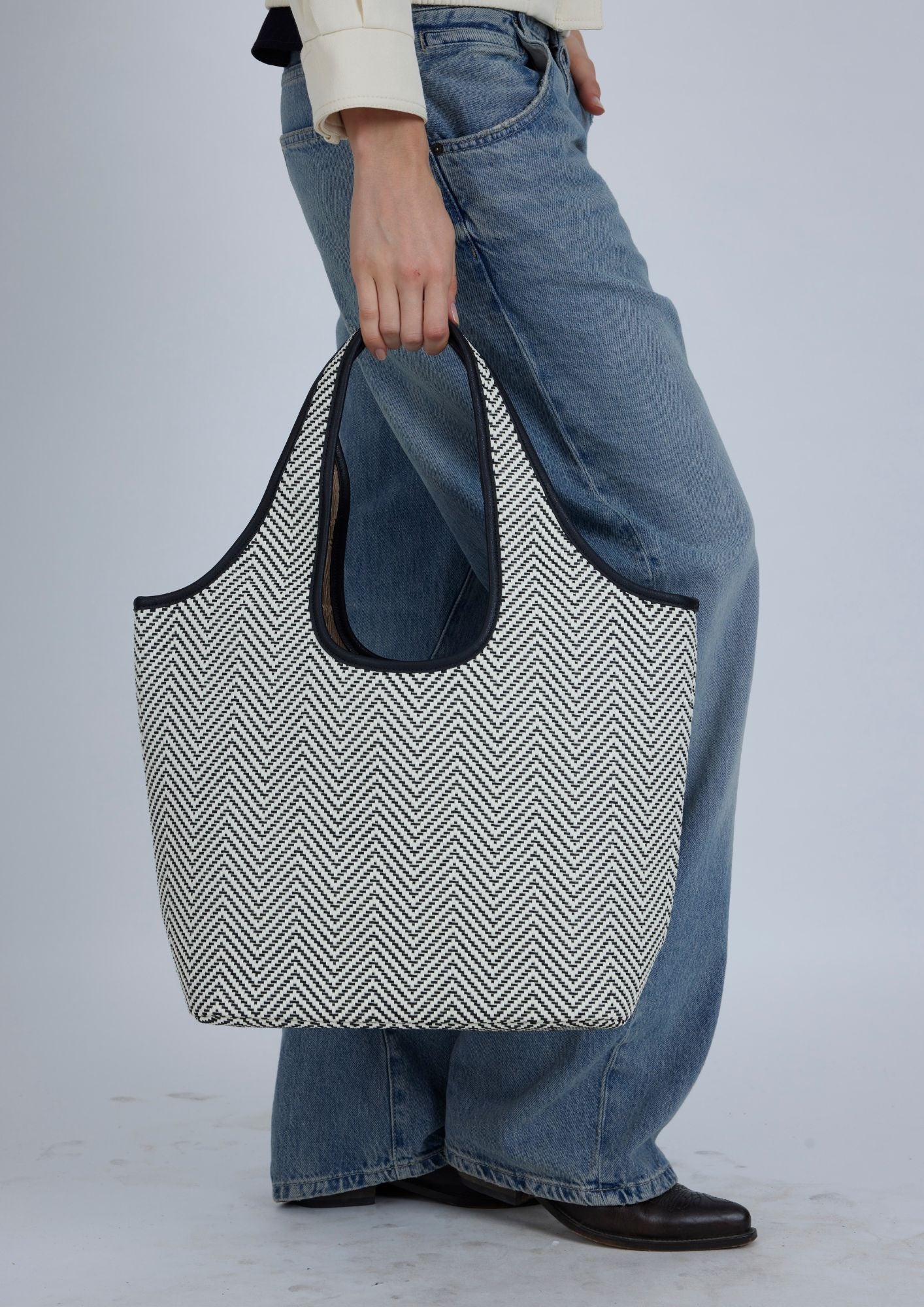 Shopper bag by Lonbali combines functionality and sophisticated design, ideal for those looking for style without sacrificing practicality. It features a textured herringbone pattern finish that adds a modern and elegant touch in black and white tones.