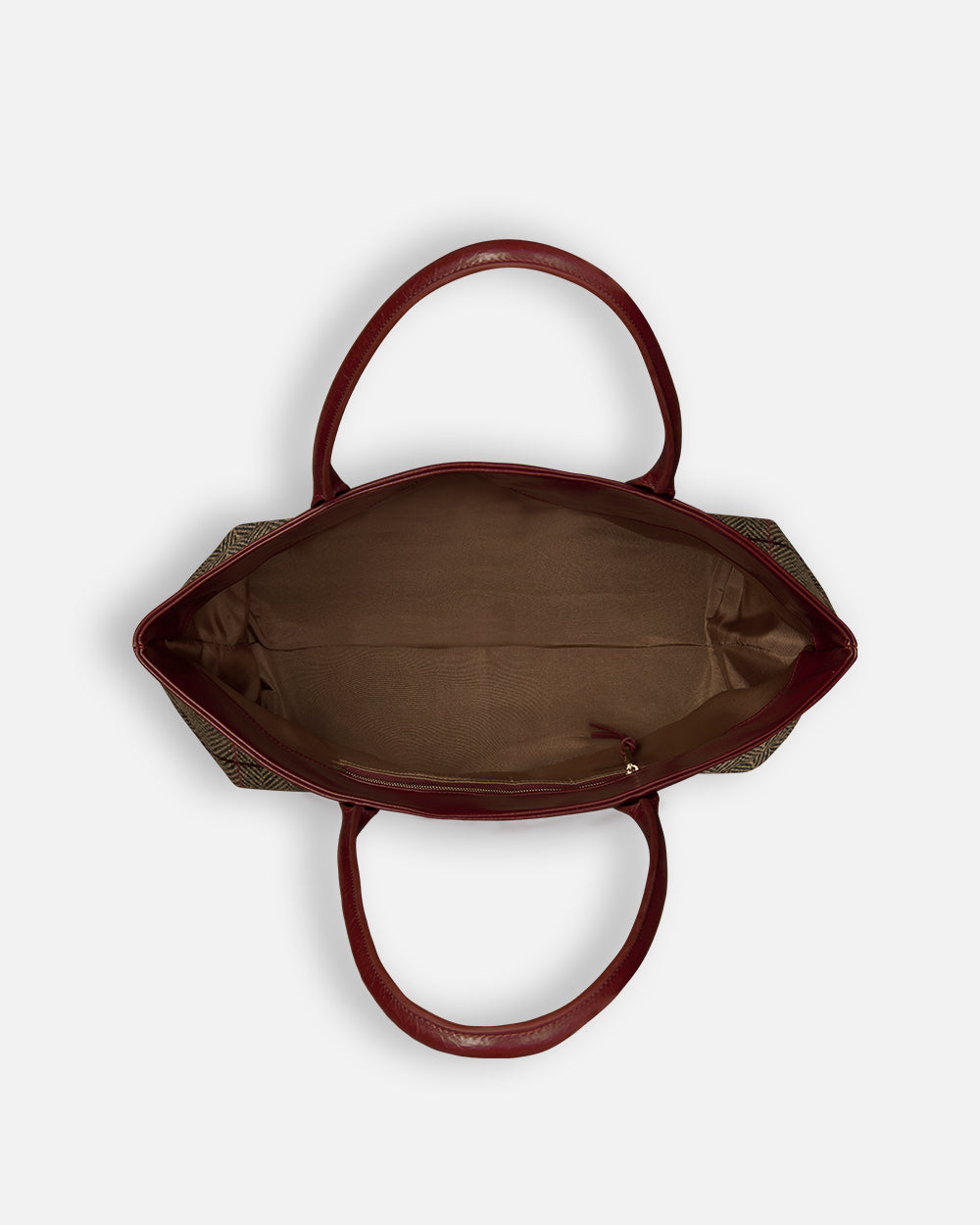 Classic elegance and modern functionality come together in the Edinburg Tartan Red Tote Bag. Its design combines an exquisite burgundy textured top with a tartan-inspired tweed body, creating a sophisticated and timeless contrast.