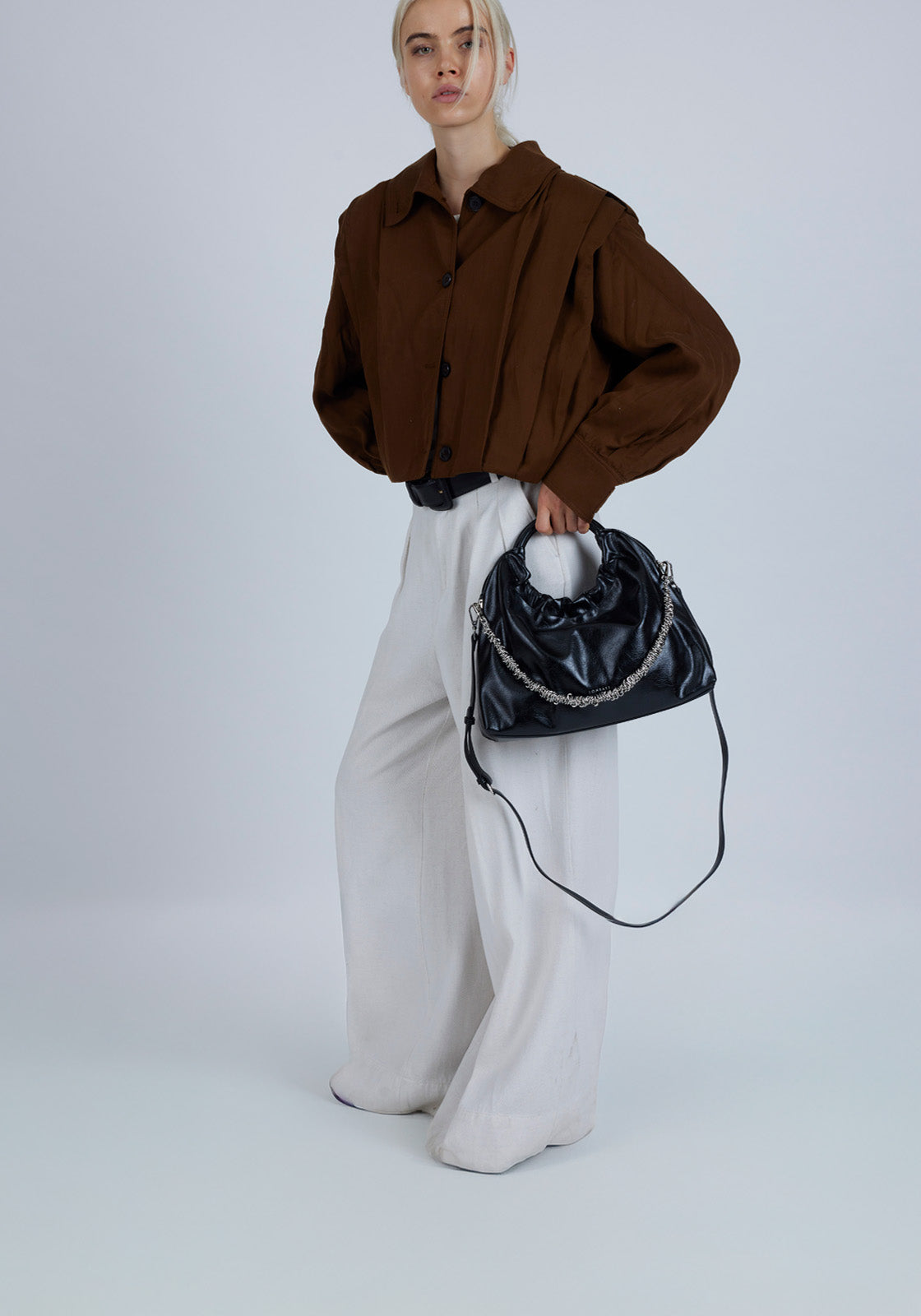 Its characteristic ruched handle adds style and comfort when carried by hand, while the detachable shoulder strap with metal detail in the form of an elastic chain allows you to transform it into a crossbody bag with a lot of personality. Its roomy interior makes it the perfect companion for your everyday or a stylish night out.